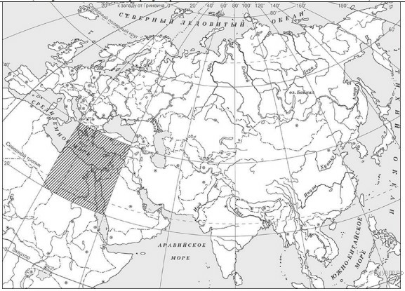 | Заштрихован четырёхугольник, образованный градусной сеткой, в котором не находятся Мекка и Медина. ИЛИ Заштрихованы два или более четырёхугольника, в одном из которых находятся Мекка и Медина. ИЛИ Задание не выполнено | 0 |