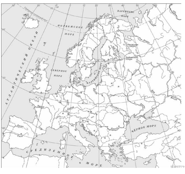 Заштрихуйте на контурной карте четырёхугольник, образованный градусной сеткой, в котором находится древнерусский город Новгород Великий.